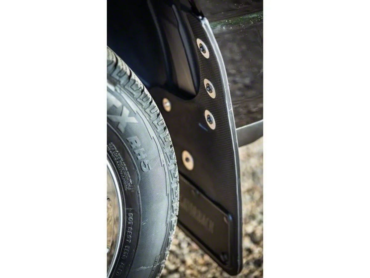 Vigorous Grit Blocking. Protect your vehicle and others on the road with these durable mud flaps. Made from strong ABS plastic, these mud flaps are molded with a subtle RAM logo and are made to withstand harsh conditions and prevent mud, rocks, and other debris from damaging your vehicle. The textured surface helps prevent grime buildup and makes cleaning a breeze, ensuring your mud flaps maintain their sleek appearance.