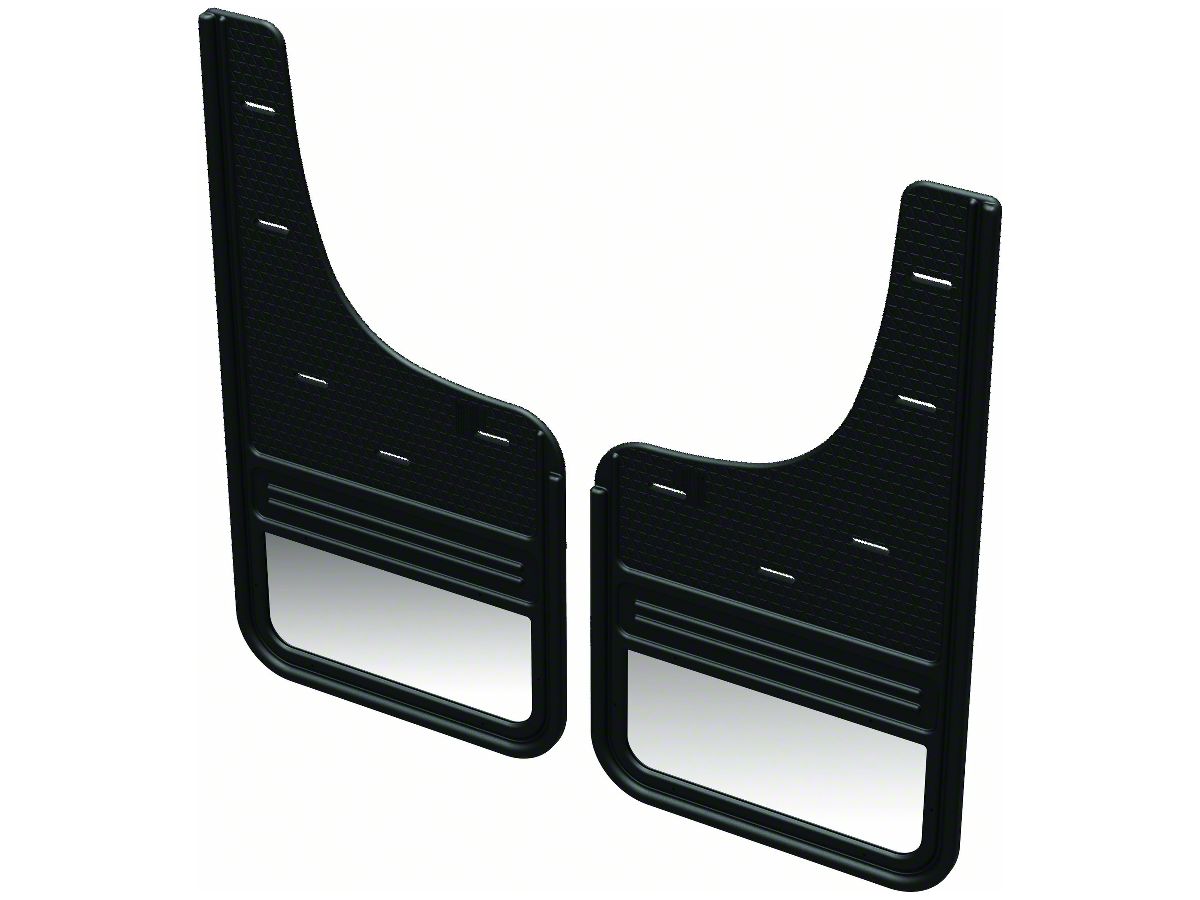 Heavy-Duty Protection. Protect your vehicle from road debris and mud with the No-Drill Mud Flaps with Stainless Plate for the front. This pair of mud flaps is designed with an embedded stainless steel plate, adding a sleek touch while ensuring durability. Each flap measures 12 inches in width and 22 inches in length, made from heavy-duty rubber materials to withstand the elements and the road's harsh conditions.
