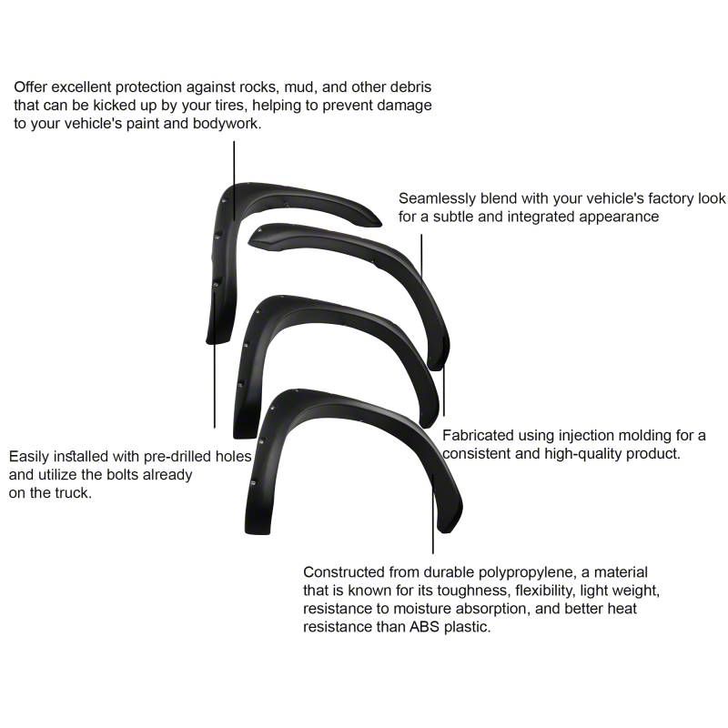 OE Factory Style Fender Flares seamlessly blend with your vehicle's factory look for a subtle and integrated appearance. They offer excellent protection against rocks, mud, and other debris that can be kicked up by your tires, helping to prevent damage to your vehicle's paint and bodywork. Constructed from durable polypropylene, a material that is known for its toughness, flexibility, light weight, resistance to moisture absorption, and better heat resistance than ABS plastic. Fabricated using injection molding for a consistent and high-quality product. Easily installed with pre-drilled holes and utilize the bolts already on the truck.