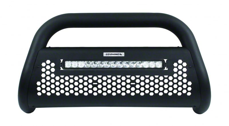 Stylish and Off-Road Functional. Got a worn-out front bumper or simply want to enhance the front fascia of your vehicle? Let the Go Rhino RC2 LR Bull Bar with 20-Inch LED Light Bar - Textured Black do that for you. Brawny and bold with steel mesh covers, this accessory will not just boost the aesthetic value of your truck. It will also enable you to install 4 3-inch LED Cube lights for enhanced illumination off-road, as well as a winch at a max rating of 12,500 pounds behind the removable covers for getting you or others out of stranded situations.
