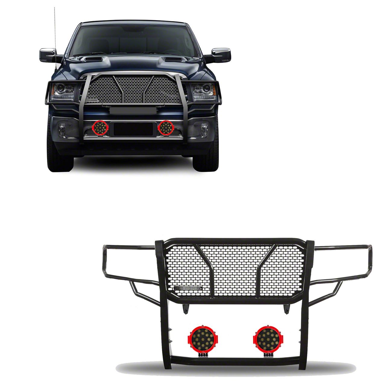 Protect Your RAM with the Rugged Heavy Duty Grille Guard. The Rugged Heavy Duty Grille Guard with 7-Inch Red Round Flood LED Lights offers superior front-end protection for your RAM 1500. Designed for off-road enthusiasts and towing professionals, this grille guard protects your vehicle from debris, branches, and other road hazards. The included LED lights enhance visibility in low-light conditions, making it a functional and stylish upgrade for your truck.
