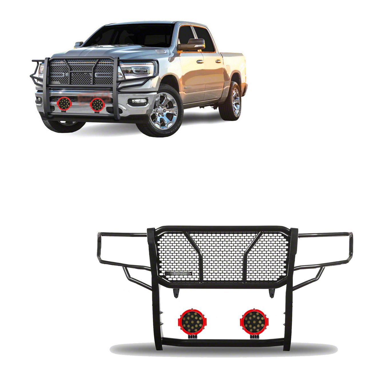 Application. The Rugged Heavy Duty Grille Guard with 7-Inch Red Round Flood LED Lights fits 2019-2024 RAM 1500 models, excluding EcoDiesel, Rebel & TRX.