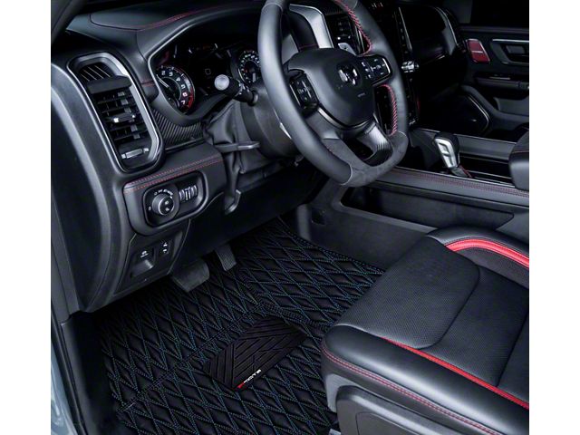 Stylish Interior Defense. This Floor Mat Set provides durable, full-cab protection for your 2019-2024 Dodge RAM 1500 Crew Cab with front bucket seats. Designed to shield your truck’s carpeting from everyday messes, this mat set balances rugged functionality with a unique aesthetic. The matte black finish combined with matte blue stitching adds a custom look that upgrades your interior while offering dependable coverage.