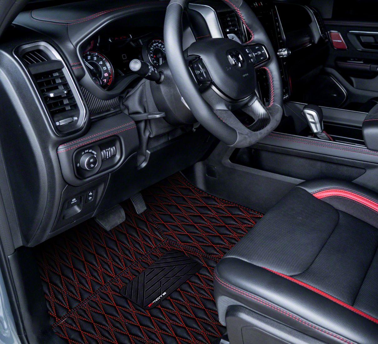 Application. The Single Layer Diamond Front and Rear Floor Mats; Black and Red Stitching fits 2019-2024 RAM 1500 Quad Cab with Front Bucket Seats models.