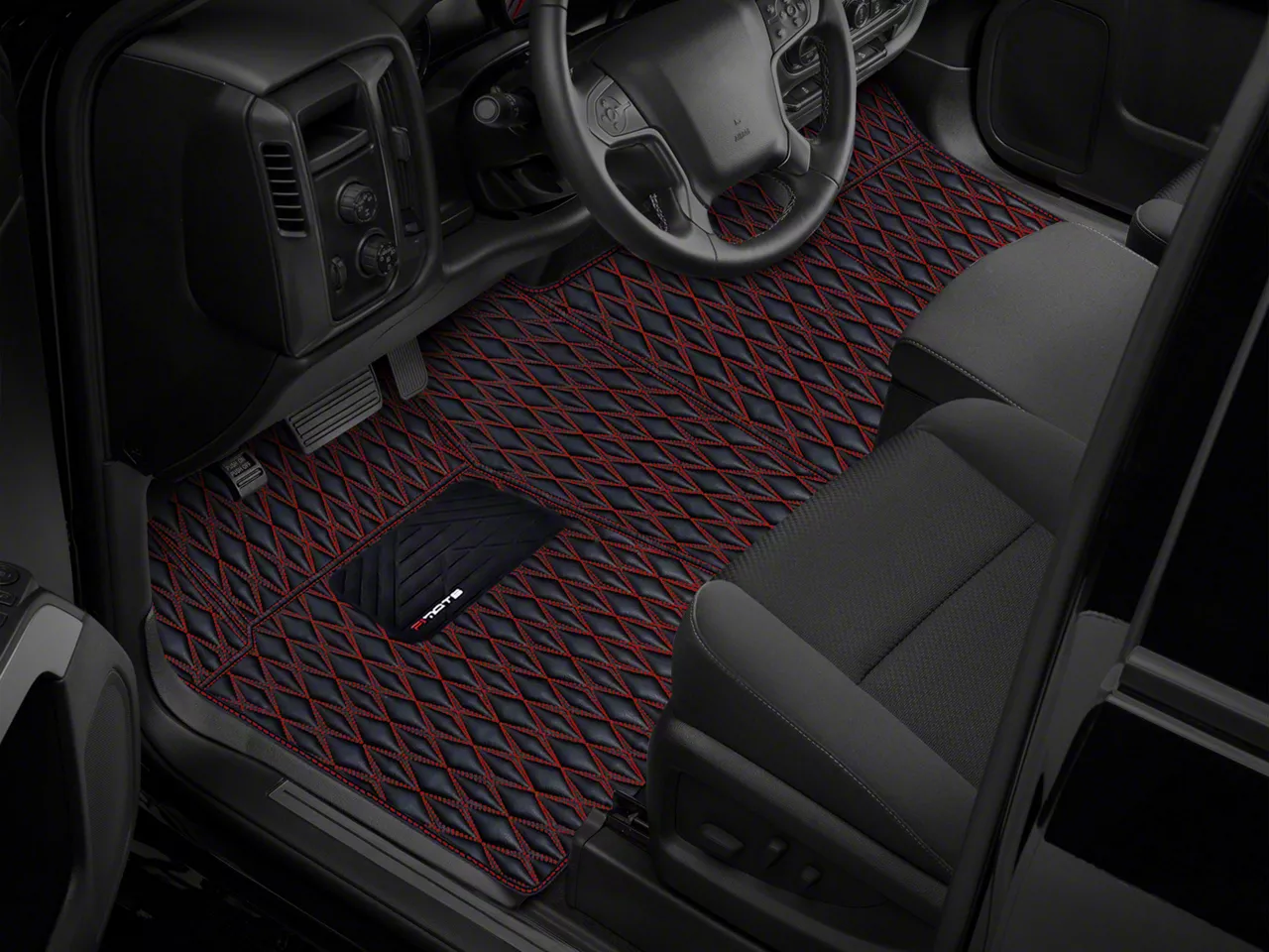 Complete Spills, Dirt, and Wear Protection. The Single Layer Diamond Front and Rear Floor Mats are specially engineered for your Dodge RAM 1500 Quad Cab model. These mats offer a stylish design with Black and Red Stitching and provide extensive floor coverage, ensuring nearly complete protection against spills, dirt, and wear.