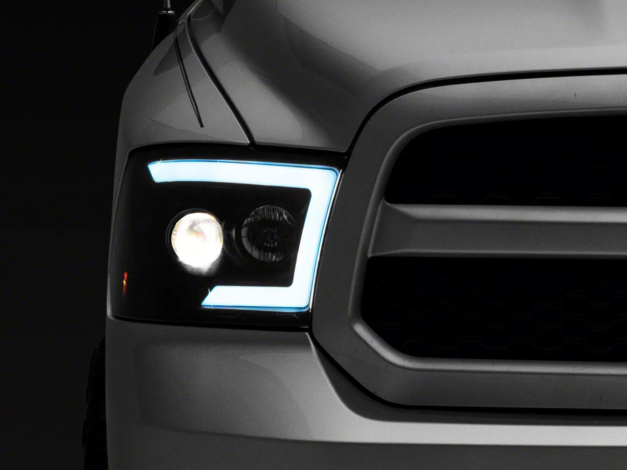 Projector Style LED Headlights. Add flare to your RAM 1500 and safety to your driving with this Switchback Sequential LED C-Bar Projector Headlights; Matte Black Housing; Smoked Lens. On top of its enhanced intensity and focused light beam, it also sports a razor-sharp design that enhances the overall appeal of your vehicle.
