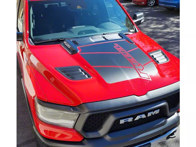 Application. This V2 Center Hood Graphics in Matte Black fits all 2019-2025 RAM 1500 Rebel models.