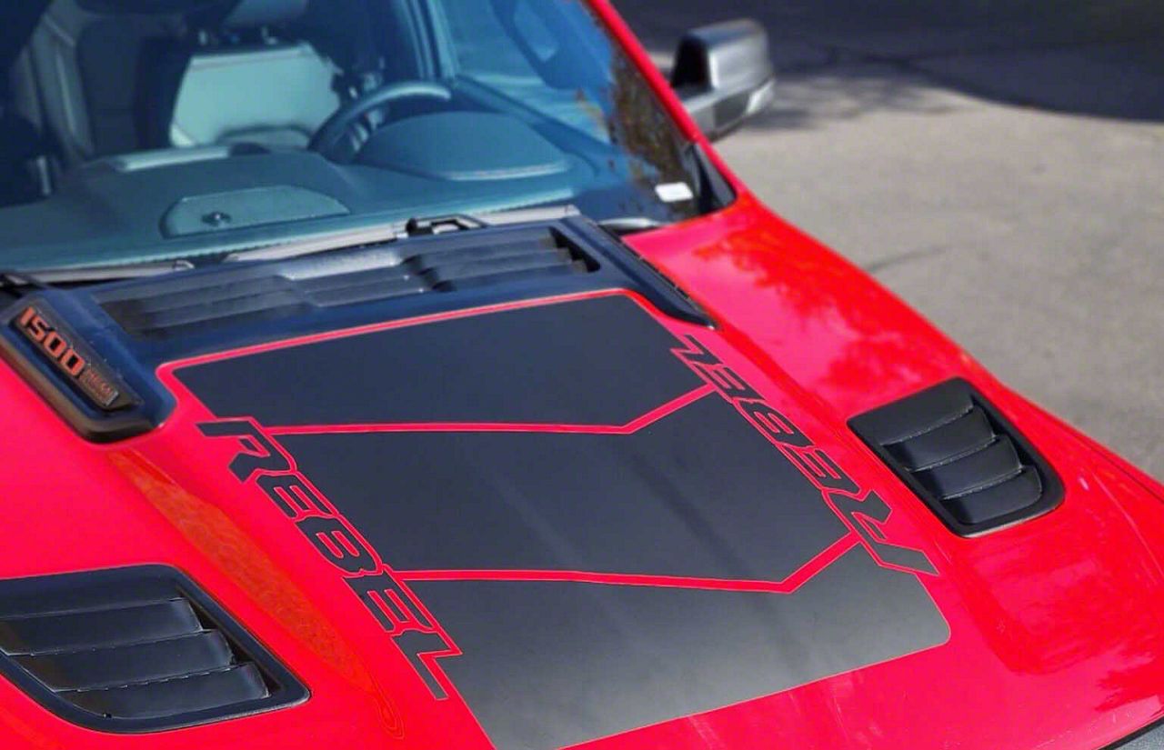 Application. The V4 Hood Graphics; Matte Black fit 2019-2026 RAM 1500 Rebel models.