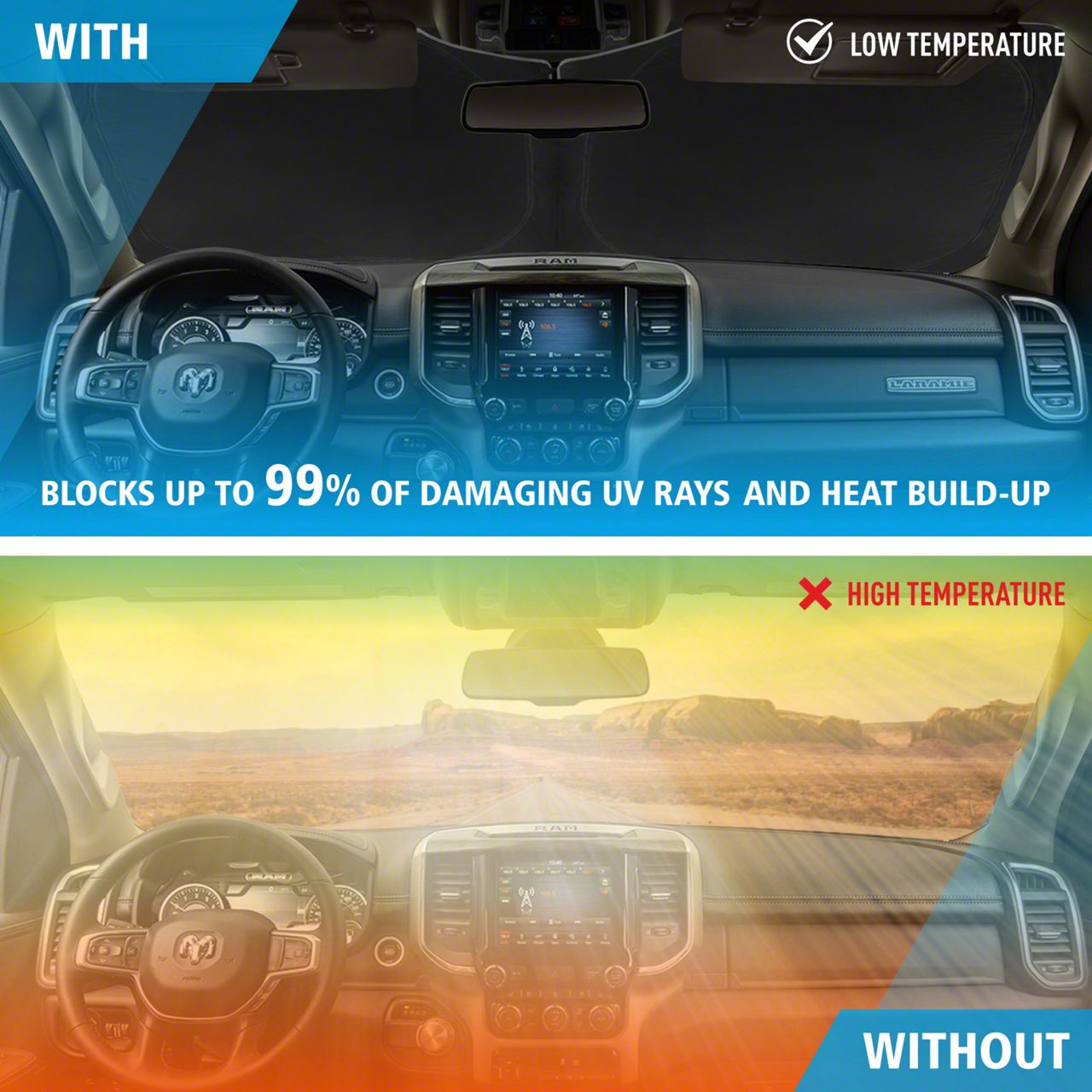 Blocks Heat for Cool Interior. Our Foldable Windshield Sun Shade is a must-have accessory made specifically for your RAM 1500. This custom-fit sun shade is designed to block the scorching heat of the sun and keep your vehicle's interior cool and comfortable. Its foldable design allows for convenient storage, saving valuable space in your vehicle when not in use. To ensure a perfect fit, the sunshade easily unfolds and covers the entire windshield, providing maximum coverage and protection.