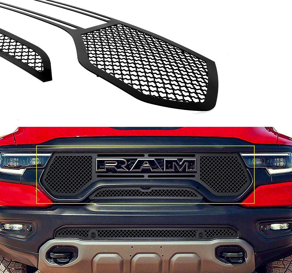 Application. The Wire Mesh Upper Grille Insert; Black fits 2021-2025 RAM 1500 TRX models.