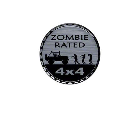 Appearance. This circular badge features "ZOMBIE RATED" in black with an etching of a Jeep and 3 zombies staggering, also in black. They have a silver backing, while "4x4" is etched in silver below the panorama with a black backing.