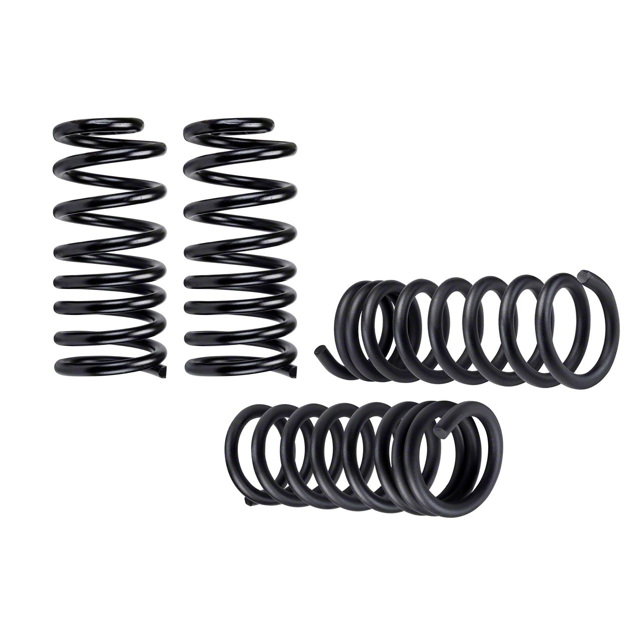 Construction and Appearance. This leveling kit features heavy-duty front coil springs rated at 4,437 pounds and matching rear coils rated at 2,475 pounds, providing enhanced support and load stability. The springs are precision-engineered to maintain proper geometry and offer a smooth, controlled ride. Finished with a durable powder coating, the components resist corrosion and deliver a clean, factory-style appearance once installed.