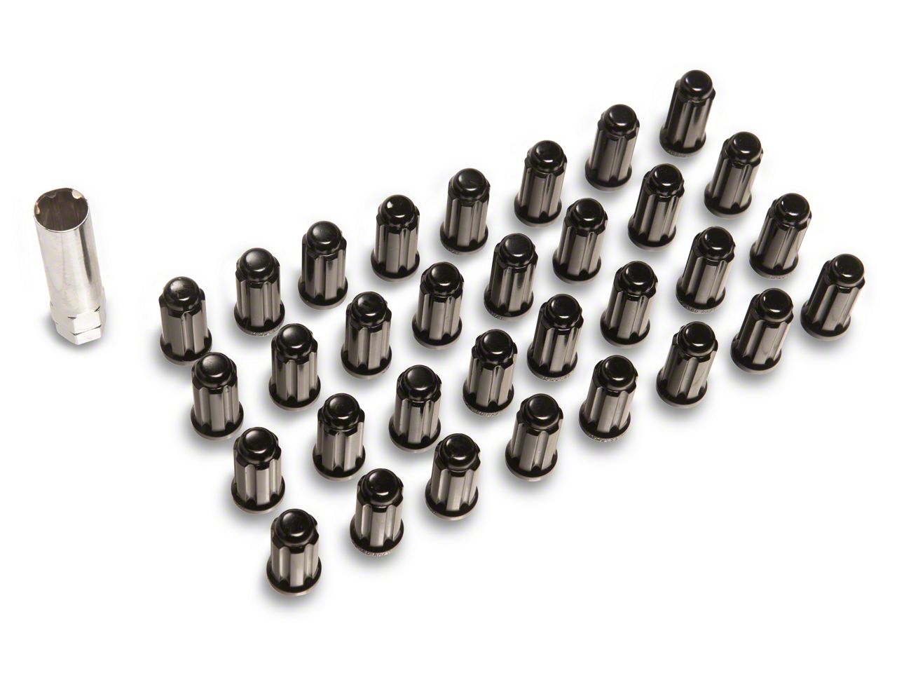 Robust and Resistant. These lug nuts are built to last, with a robust construction that resists rust and corrosion, ensuring they maintain their appearance and functionality over time. The black finish provides a sleek, modern look that complements a wide range of wheel styles, enhancing the overall aesthetic of your RAM 2500. The set includes 32 lug nuts, along with a special spline key for easy installation.