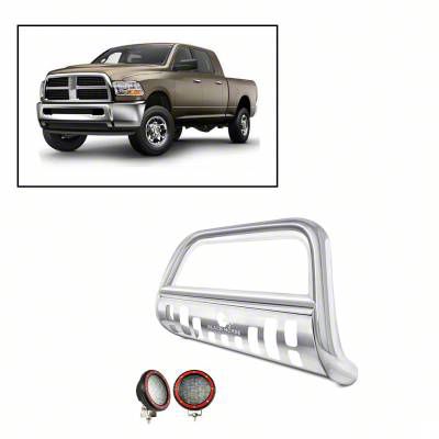 Stylish Front-End Protection and Illumination. The Bull Bar with 5.30-Inch Red Round Flood LED Lights and Skid Plate provides a perfect blend of functionality and style for your vehicle. Moreover, it not only enhances the front-end protection but also improves visibility during night-time driving with its integrated pair of black round LED lights in a 5.30-inch size featuring a flood beam pattern. This accessory is crucial for off-road enthusiasts and those seeking to add a rugged, yet sophisticated look to their Dodge RAM 2500.