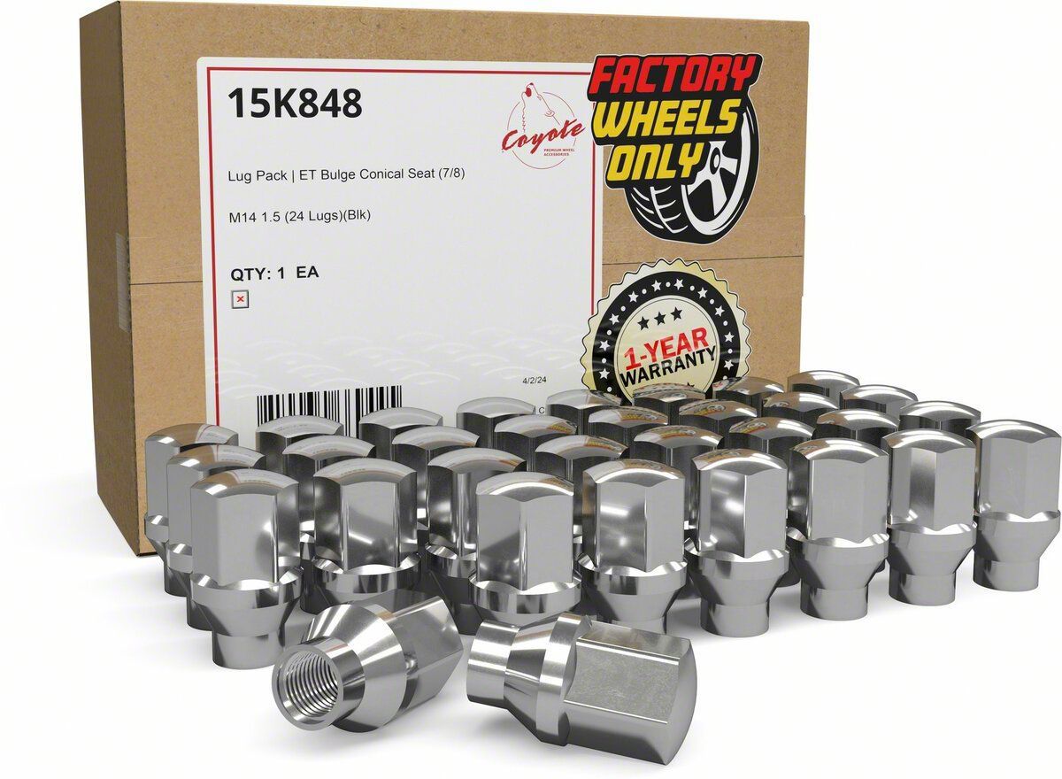 Construction and Appearance. Manufactured with high-quality materials and built using a solid 1-piece design, the lug nuts in this ET OEM Factory Style Chrome Lug Nut Kit are engineered for strength and long-lasting durability. The chrome finish offers a clean, factory-style look that resists corrosion and complements OE wheels.