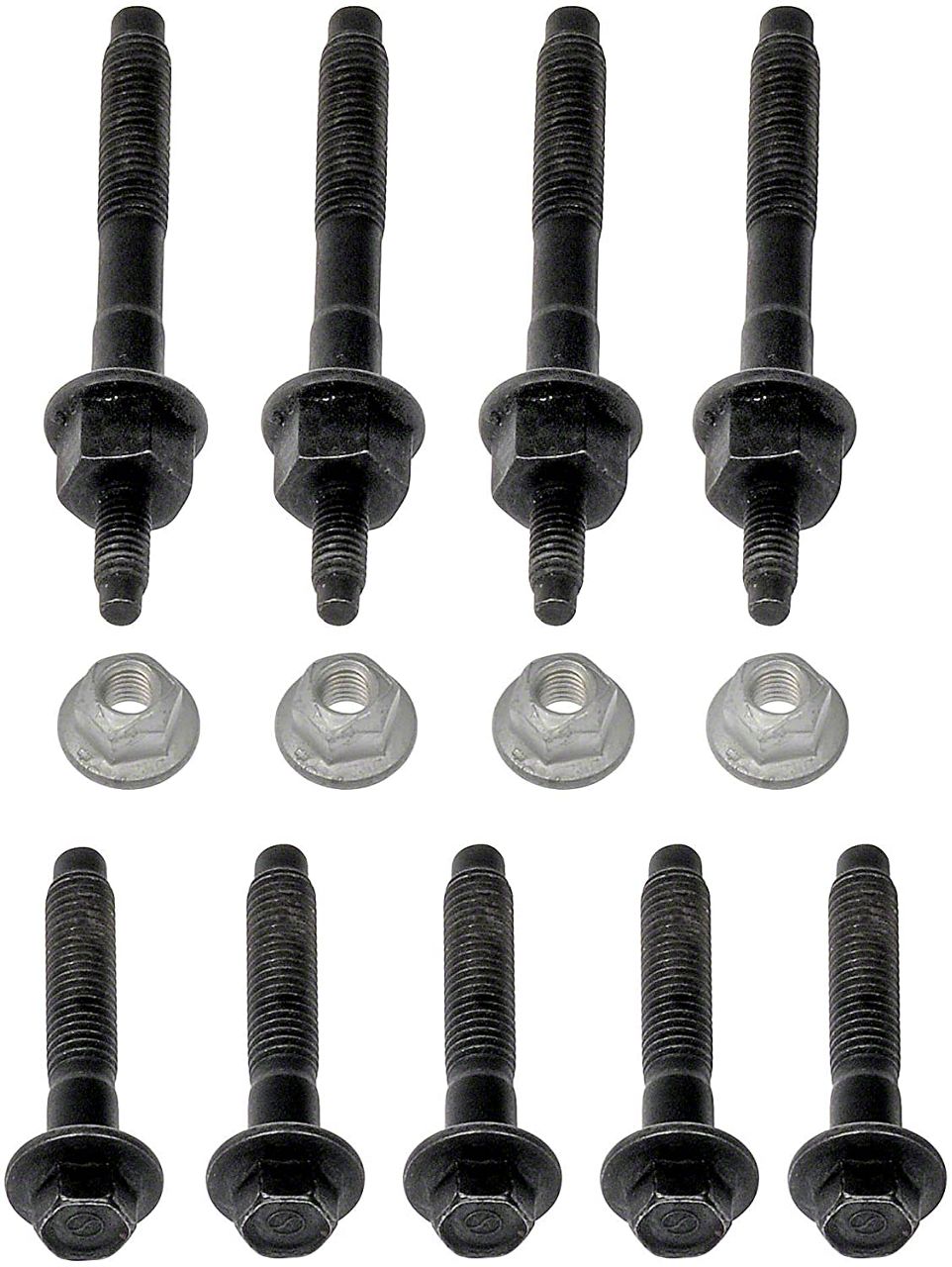 Durable Construction. This hardware kit is manufactured entirely from durable grade 10.9 steel, ensuring ample strength and clamping force to seal the exhaust manifold to the cylinder head even after hundreds of heat cycles. The included hardware is also corrosion-resistant, featuring black oxide-coated studs, bolts, and zinc-plated nuts.