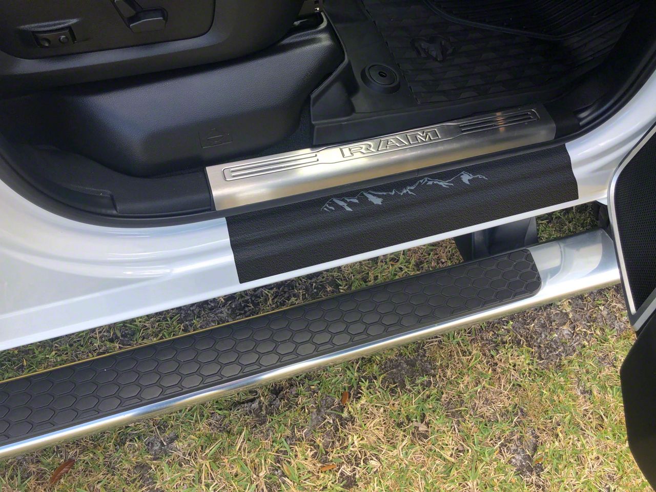 Application. A Front Door Sill Protection with Mountain Logo is meticulously crafted to be suitable for 2019-2026 RAM 2500s.