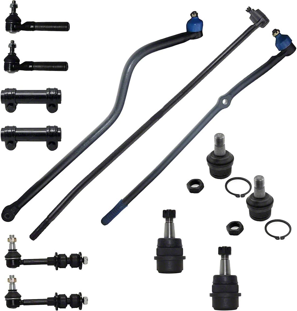 Kit Includes: (2) Upper Ball Joint + (2) Lower Ball Joint + (2) Outer Tie Rod + (2) Adjusting Sleeve + (1) Track Bar + (1) Right Outer Tie Rod + (1) Inner Tie Rod + (2) Sway Bar Link