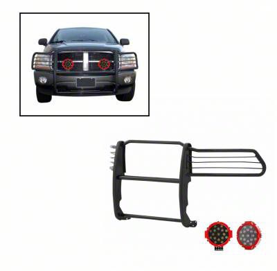 Application. This Grille Guard with 7-inch Red Round LED Lights; Black fits all 2003-2005 RAM 2500 models.