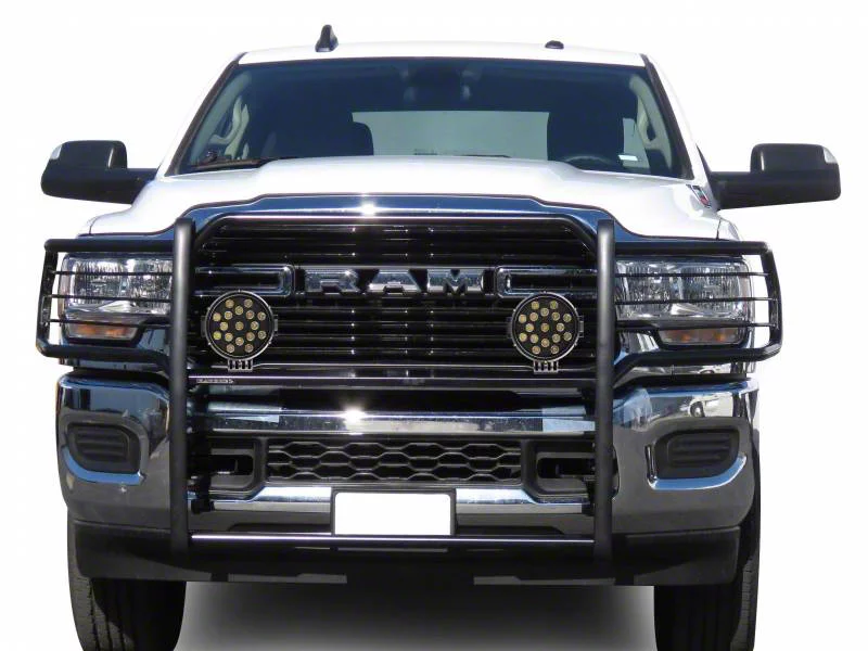 Application. This Grille Guard with 7-Inch Round LED Lights in Black fits all 2019-2026 RAM 2500 models.