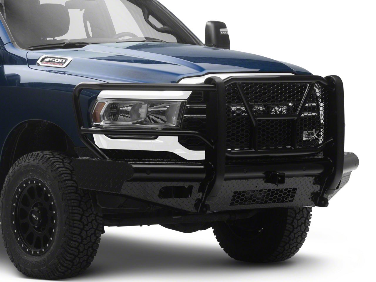Brawnier Front End Appearance and Performance. Confidently take on the most formidable off-road environments with the help of the Textured Black HDX Bandit Front Bumper. This awesome front bumper upgrade isn’t only remarkably tough, but it also offers maximum front-end protection thanks to its honeycomb mesh grille and 2-inch tubular wraparound wings. Plus, it comes with a receiver hitch and shackle mounting, so you can further improve your RAM 2500’s vehicle overall utility as a result.