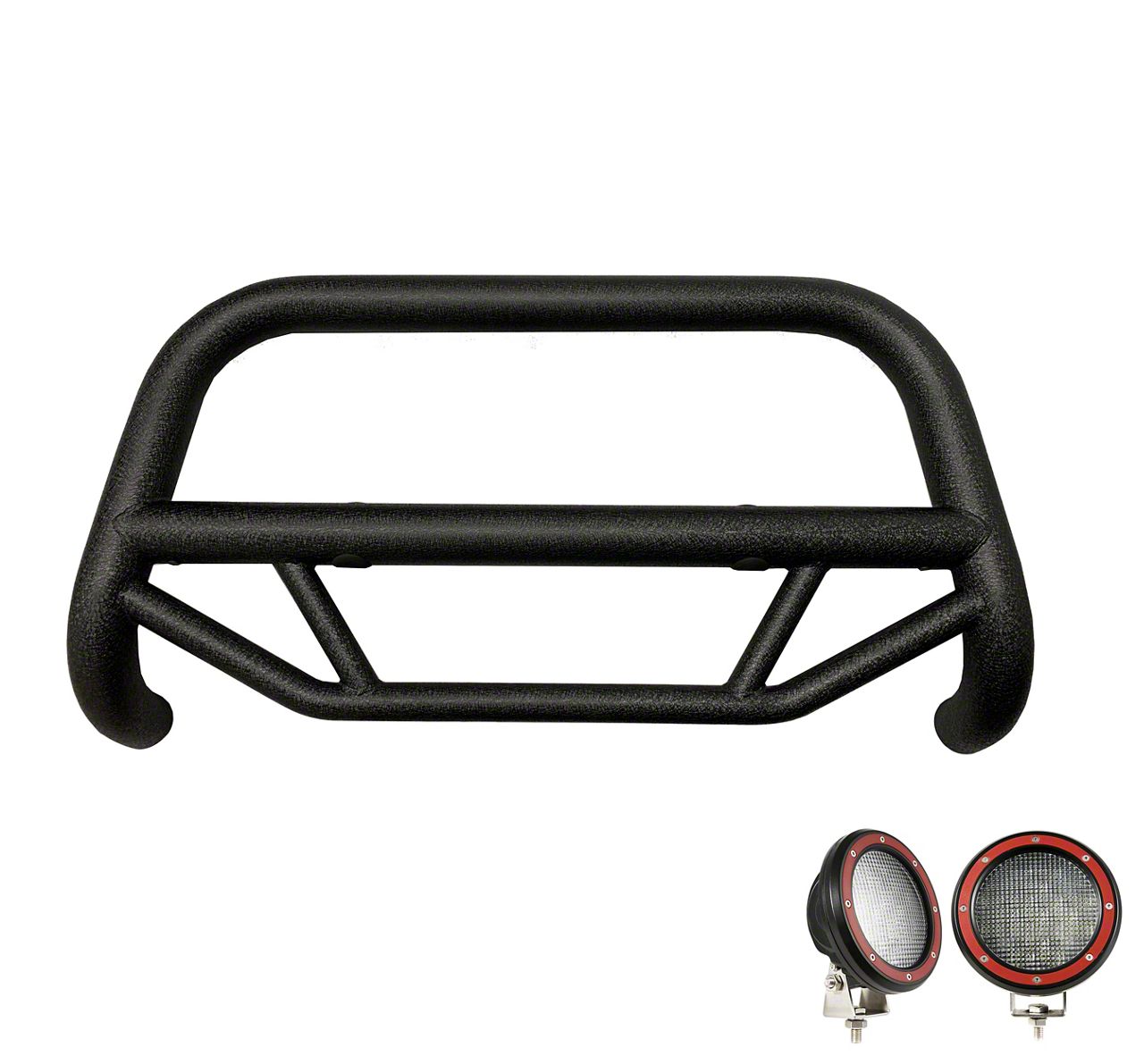 Frontal Protection. The Max Bull Bar with 5.30-Inch Red Round Flood LED Lights enhances your RAM 2500's aesthetics while protecting against minor impacts and damages. This accessory adds a bold, unique style, seamlessly blending functionality with design. Additionally, the included 5.30-inch red round flood LED lights illuminate the road ahead, providing improved visibility during night drives or in adverse weather conditions.