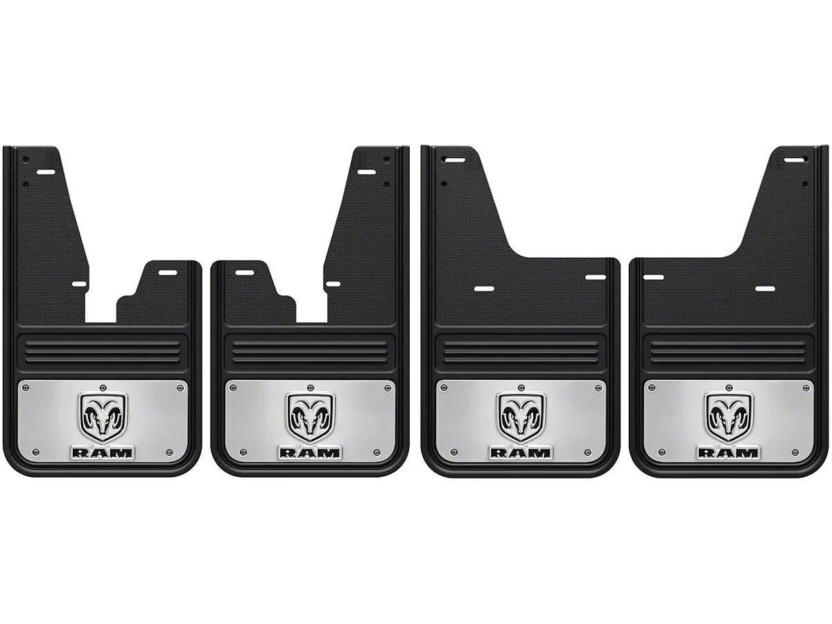 Convenience and Protection. Experience superior protection, style, and convenience in one exceptional package with the No-Drill Mud Flaps with RAM Head Logo for Front and Rear. These mud flaps feature the iconic RAM Head logos officially licensed by MOPAR die-stamped on them. Perfectly compatible with trucks equipped with OEM fender flares, they boast a custom cut style, measuring 12x20 inches.