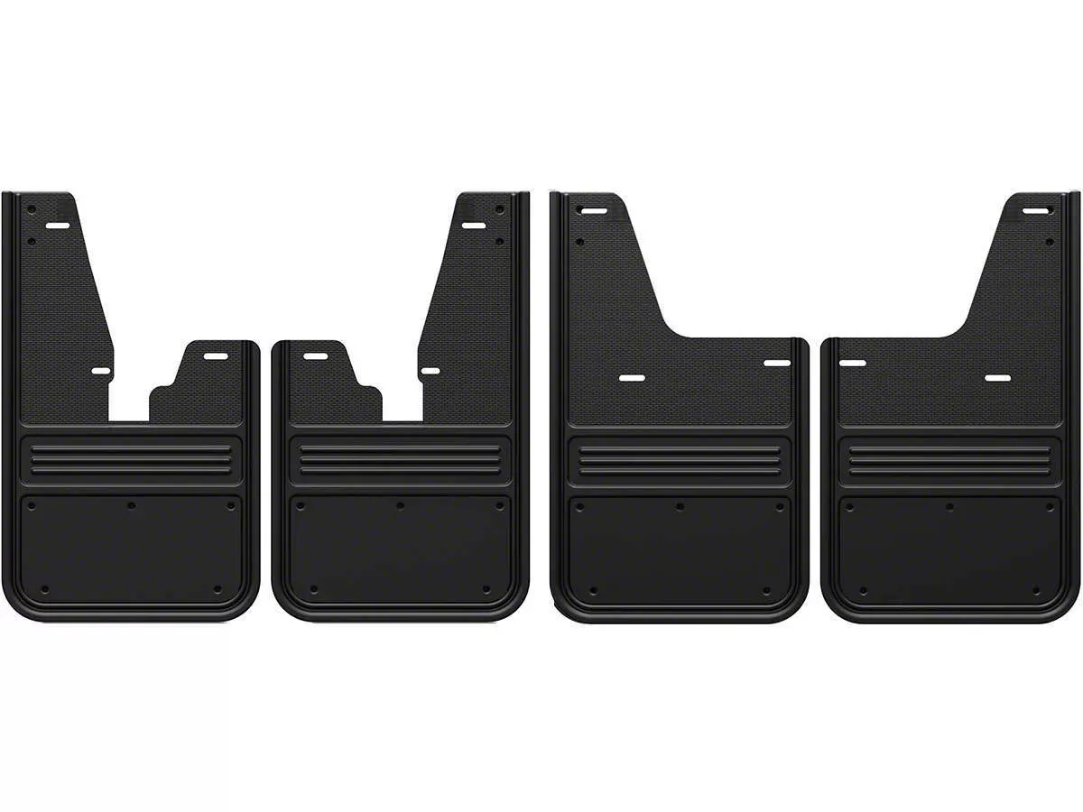 Rugged Design. Upgrade your truck's protection and style with the No-Drill Mud Flaps; and Rear. These heavy-duty mudguards are built to the highest industry standards, boasting a rugged design and a top-quality finish that adds a touch of sophistication to your vehicle. These mudflaps fit seamlessly inside the wheel well, making them compatible with step bars, power boards, or side steps.