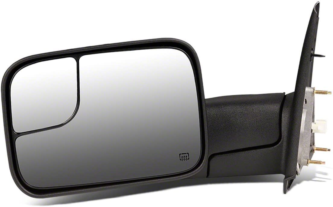 Construction and Appearance. This towing mirror, sold only for the driver side, is power adjustable with heating elements to defrost the mirror. It features a black housing and varying angles for optimum viewing.
