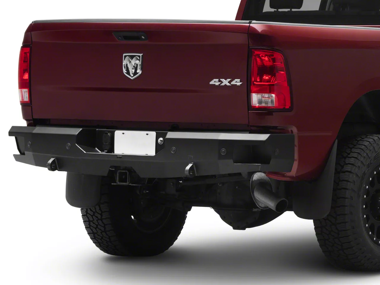 Massive Rear Shielding. The Premier Series Rear Bumper; Black Textured is the perfect upgrade for your hardcore RAM. Give your massive machine a buffed-up bumper that can withstand heavy impacts without sustaining any visible damage. This upgraded bumper also features a lowered and studded boarding platform which makes it easier to access your truck bed without having to strain or straddle over your bed rails.