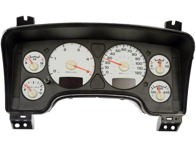 Black Bezel. Boasting a sleek black-colored bezel, this cluster seamlessly complements your Dodge RAM 2500's interior aesthetics. The analog gauge style, paired with a robust black plastic gauge panel, ensures durability and a classic look. Navigate readings effortlessly with the red-colored pointer, which stands out against the backdrop.