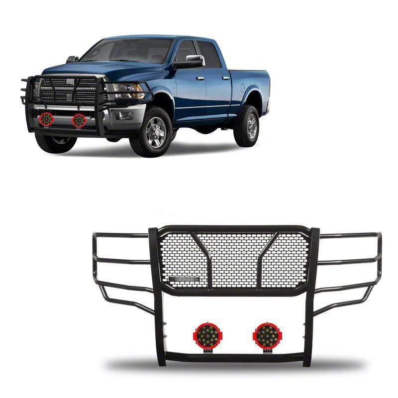 Heavy-Duty Front-End Protection. The Grille Guard is designed to deliver rugged protection for your 2010-2018 Dodge RAM 2500. Its heavy-duty design and hole-punched pattern not only add a stylish edge but also shield your truck from road debris, bumps, and potential impacts. This grille guard includes two 7-inch red round flood LED lights for enhanced visibility and functionality.