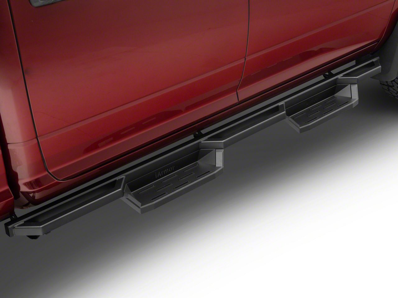 Angular Steel Assembly. These DOT certified aircraft-quality aluminum steel Square Tube Drop Style Nerf Side Step Bars are machine-bonded and mandrel-bent to achieve their distinctive design and durable shape. Each side step bar is e-dipped in rough matte black powder coating to assure weathering and rust resistance, adding to its toughness.