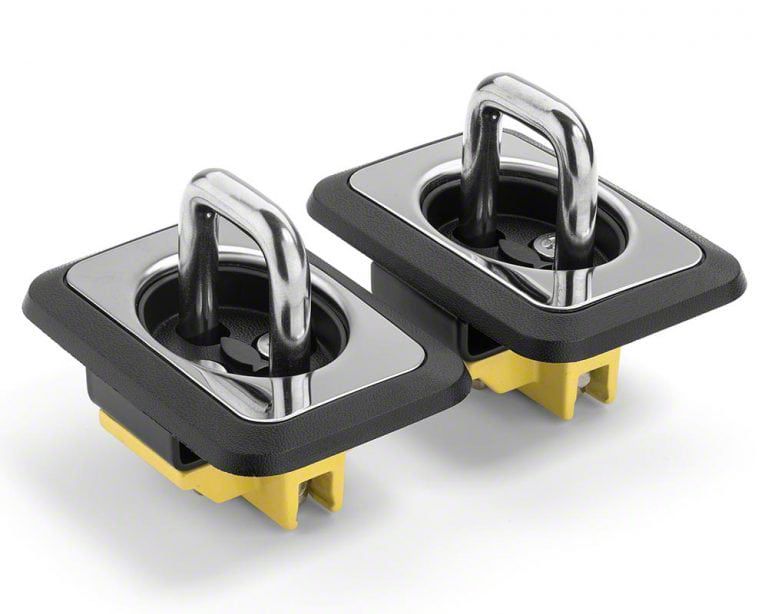Bull Rings are the premium tie-down anchor point for your truck. While the stock anchors points are inside the bed where it’s hard to reach, Bull Ring's retractable anchor points easily install into the stake pockets on top of your bed rails. Simply pop the stainless steel ring up when you want to use it to secure a load, then hit it down flush when you don’t. The stainless steel finish provides a classic look, while the nylon border matches the exact grain and color the trucks railcaps. Each is made from stainless steel for a 1000 lbs capacity, and comes with our "no bull" Lifetime Warranty. Bull Ring's stainless steel tie down anchors are an essential truck bed accessory.