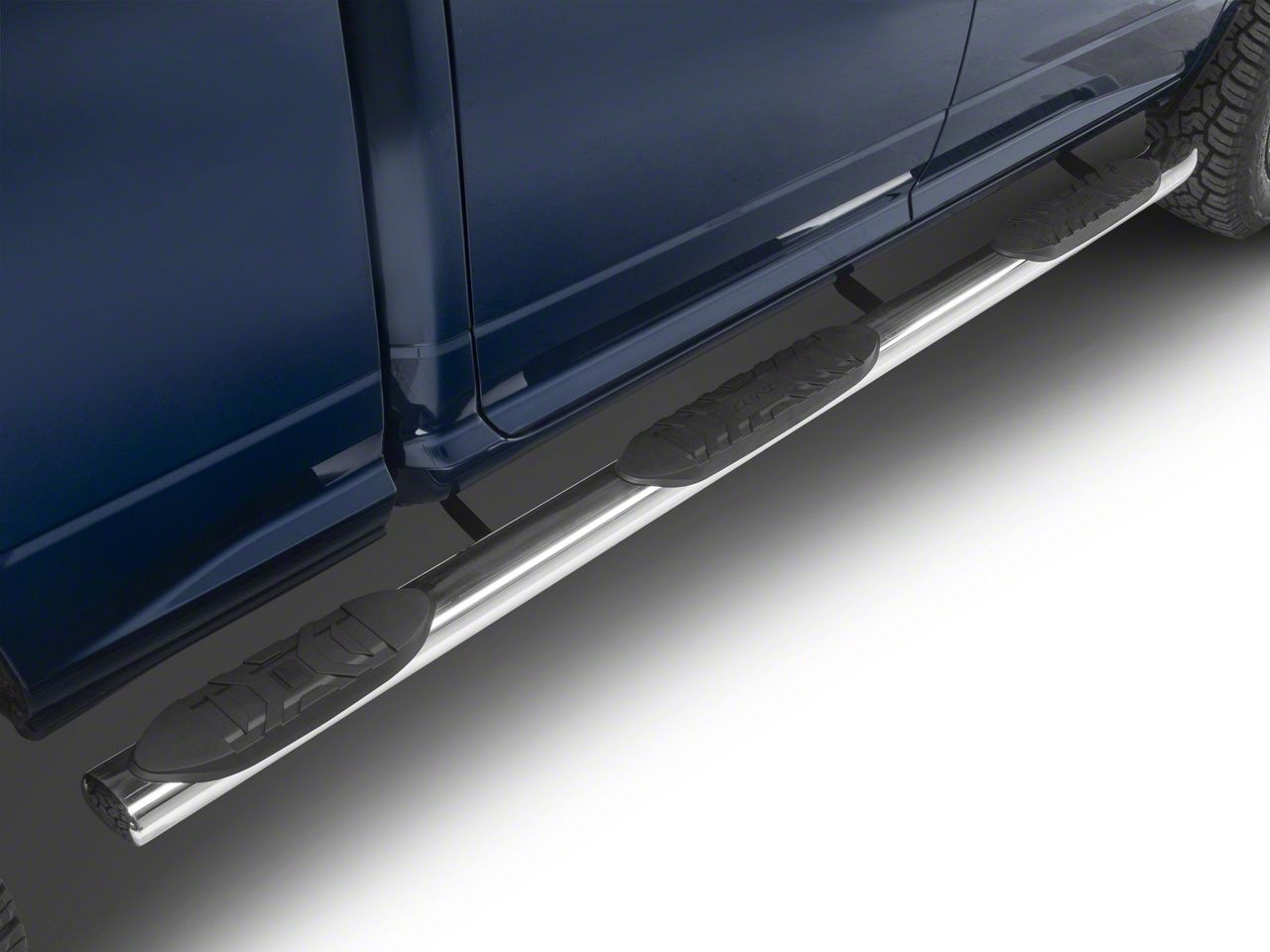 Durable Pickup Accessory. The 5-Inch Oval Wheel-To-Wheel Nerf Side Step Bars; Polished Stainless provide enhanced entry into the pickup cab and easier access to the truck bed or cargo area. Designed for convenience and safety, these nerf bars serve as reliable side steps for pickup enthusiasts seeking both function and style.