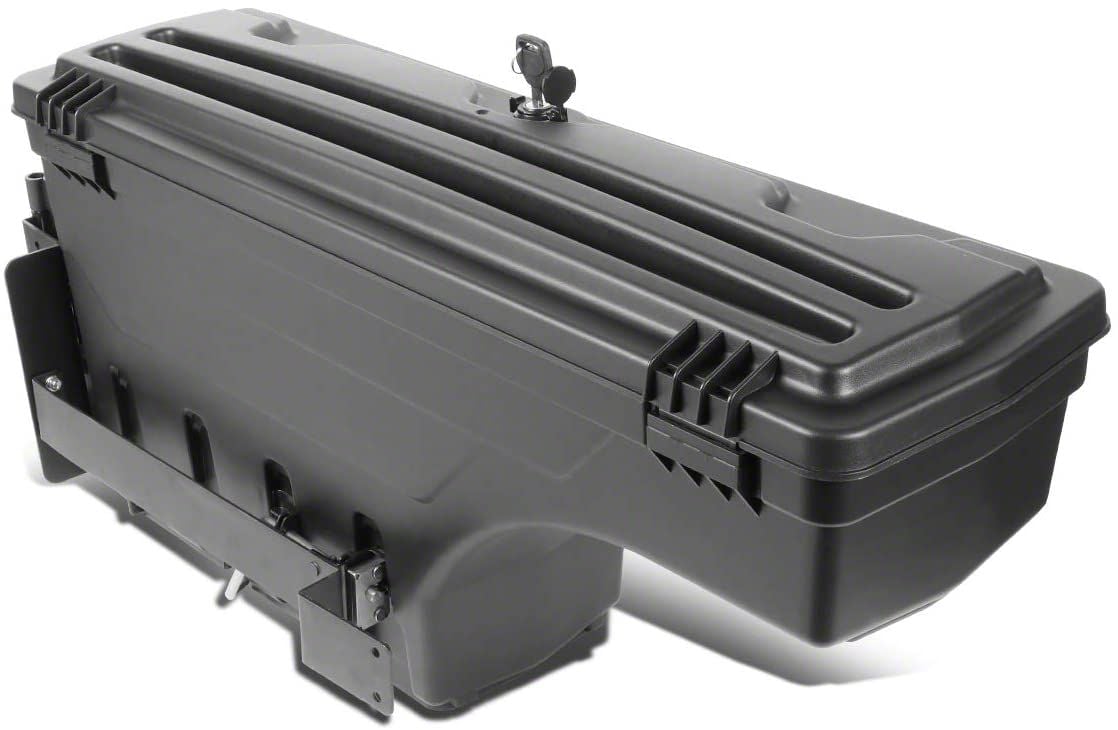 Durable Storage Solution. Looking for a storage solution that won't cramp your style? Check out the Swing Out Bed Mounted Storage Box. This handy box is perfect for holding all your gear safe and secure, whether you're headed on a road trip or exploring the great outdoors. Made of durable ABS plastic, the Swing Out Bed Storage Box is designed to withstand whatever elements you might face. It's also weather-resistant, hence, you don't have to worry about your belongings getting wet.