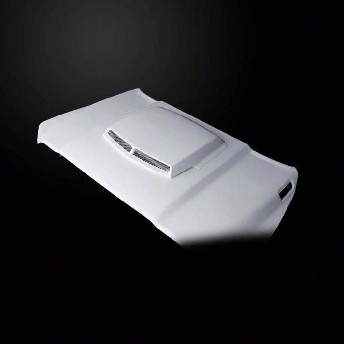 Construction and Appearance. Made from high-quality fiberglass and resin, this hood is designed with a gel-coated surface for easy preparation and painting. It also includes aluminum wire mesh grill inserts for added durability. The unpainted version allows customization to match your vehicle's finish, while its corrosion- and rust-resistant composition ensures longevity.