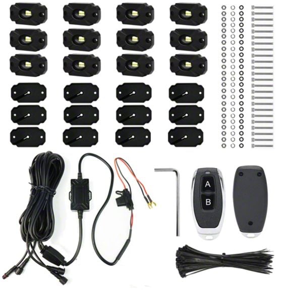 Illuminate Every Terrain. The LED Rock Light Crawler Kit is built to deliver maximum visibility during off-road adventures, rock crawling, or nighttime trail runs. Featuring 12 ultra-bright white LED rock lights, this kit lights up your vehicle's undercarriage, making it easier to navigate obstacles and enhancing your rig's trail-ready appearance in low-light conditions.