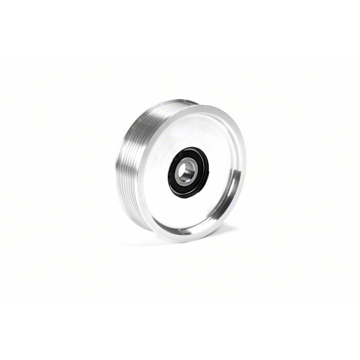 Construction and Appearance. Crafted from billet aluminum, this upper fan idler pulley offers strength and durability with reduced weight. The bare aluminum finish provides a clean, performance-oriented look under the hood. A high-quality bearing is included to promote smooth rotation and long service life, while compatibility with the required 1.8 inch factory spacer height and 2.75 inch factory mounting bolt length ensures precise fitment.