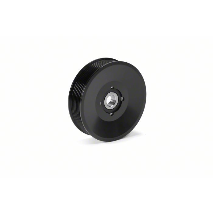 Description. Billet aluminum upper fan idler pulley in black anodized finish. Complete with bearing. Our pulley must be used with a factory bolt and spacer. Some aftermarket pulleys will switch to a different length bolt and spacer which will not work with the our billet pulley. For reference, the factory spacer measures 1.8" total height and the factory mounting bolt measures 2.75" in length.