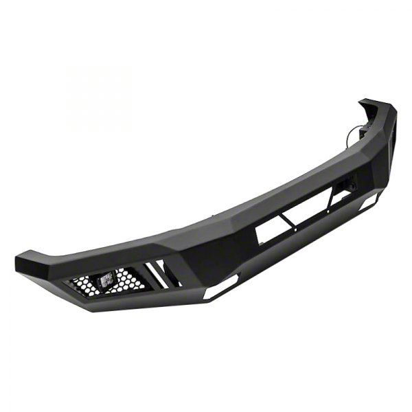Construction and Appearance. If strength is what you seek in a bumper, this one has you covered. It's constructed from heavy-duty, 11-gauge steel sheet with 3-gauge mounting brackets. Detachable punched metal grilles and mesh screen guard the light mountings. This Armour Front Bumper is finished in an impact-resistant, e-coat, powder-coated black to look sensational and ward off corrosion.
