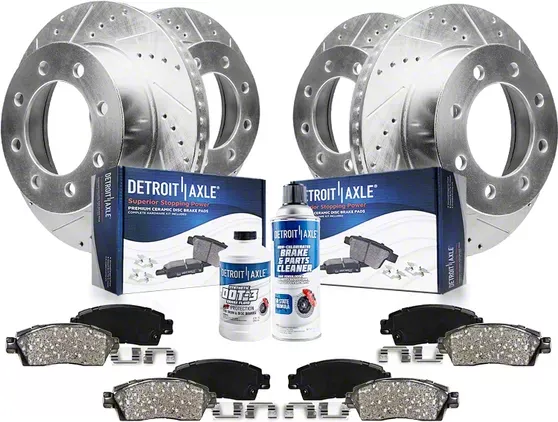 Superior Stopping Power. The Drilled and Slotted 8-Lug Brake Rotor, Pad, Brake Fluid, and Cleaner Kit is a comprehensive brake kit designed for front and rear placement that guarantees exceptional braking performance. This product exceeds OEM specifications, undergoing rigorous impact, wear, and fatigue testing to ensure reliability and longevity.