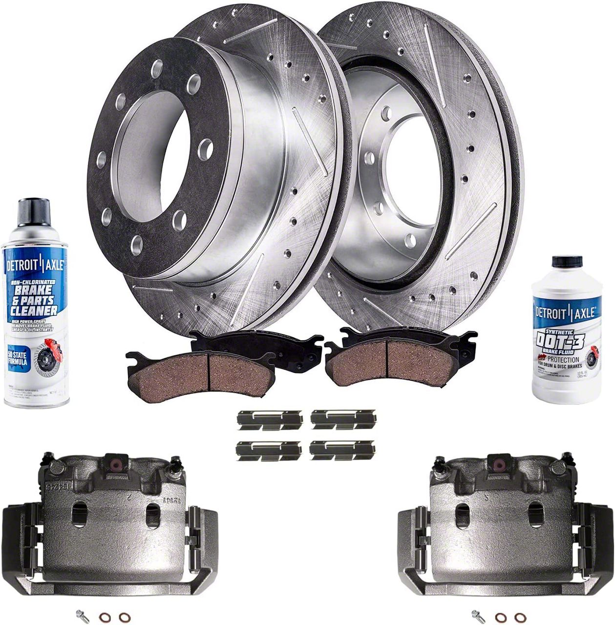Drilled and Slotted 8-Lug Brake Rotor, Pad, Caliper, Brake Fluid and Cleaner Kit; Front (03-08 RAM 3500)Find parts that fit my vehicle