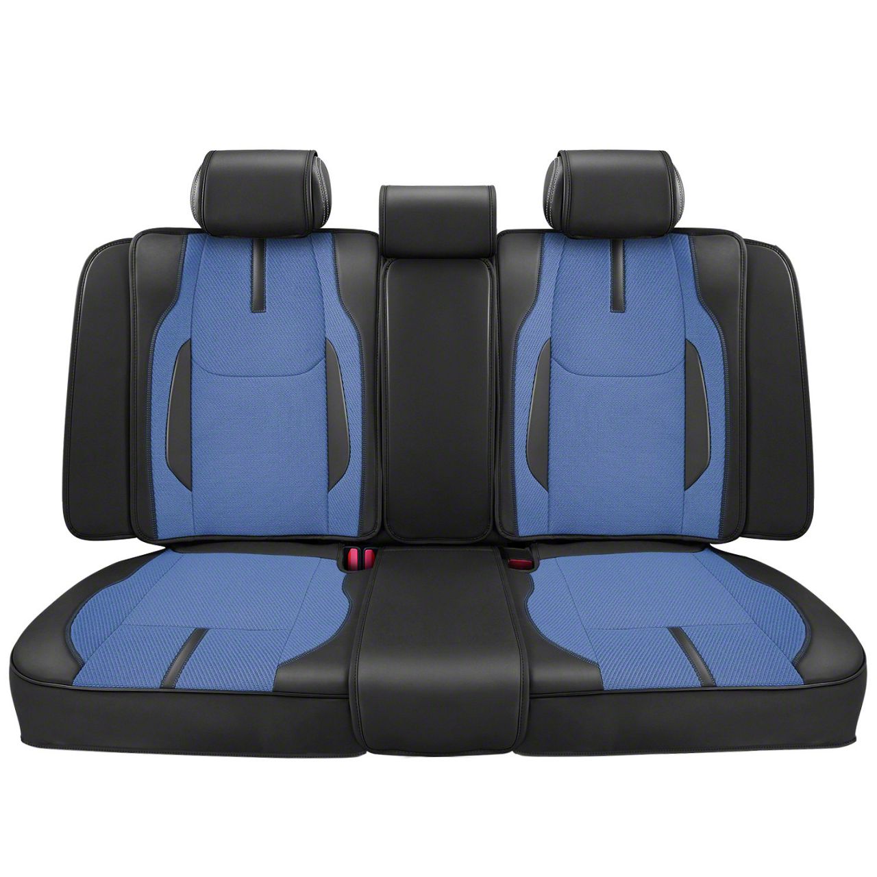 Construction and Appearance. Made from durable, water-resistant fabric, the covers feature UV-resistant material that prevents fading from sun exposure. The two-tone dark blue and black styling adds a modern, sporty look to your interior, while double-stitched seams ensure long-lasting strength. Adjustable straps keep the covers securely in place, and the design is compatible with side airbags for safety.