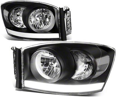 Modern Lighting Assembly. Be safe as you drive through dark roads and trails with these Factory Style Headlights with LED DRL; Black Housing; Clear Lens for your RAM 3500. Sporting power-efficient LEDs for its daytime running lights, it adds a sleeker appearance to your ride as well as improves its visibility. Sporting the same wiring and mounting connections as your original part, it is a quick install that matches your stock setup.