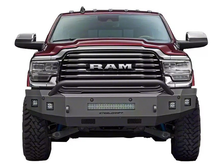 Construction and Appearance. Crafted from top-grade 16-gauge steel, this bumper features a textured matte black finish. What's more? The integrated bullnose bar enhances protection while adding a sleek look to your RAM 3500.