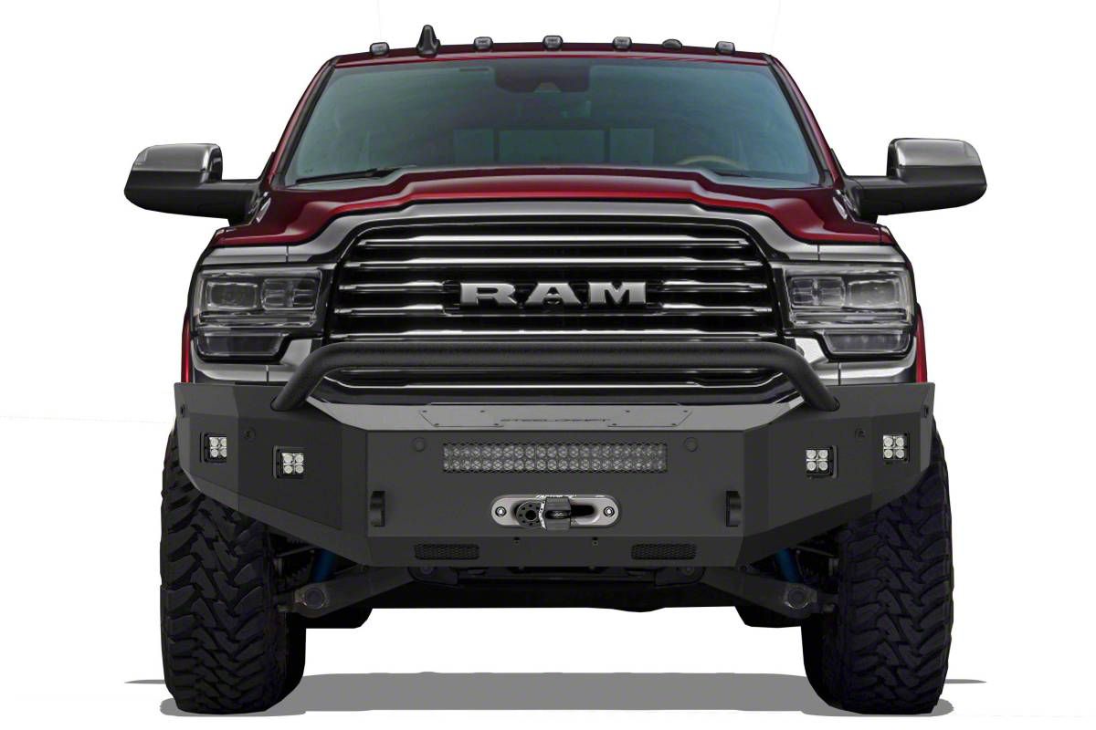 Rugged Front-End Winch Support. The Fortis Winch Front Bumper with Hoop offers heavy-duty front-end protection and winch capability for 2019-2026 RAM 3500 trucks. Designed with off-road performance and utility in mind, this bumper includes a fully welded bull nose hoop with integrated light tabs, giving your truck bold styling and superior recovery readiness.