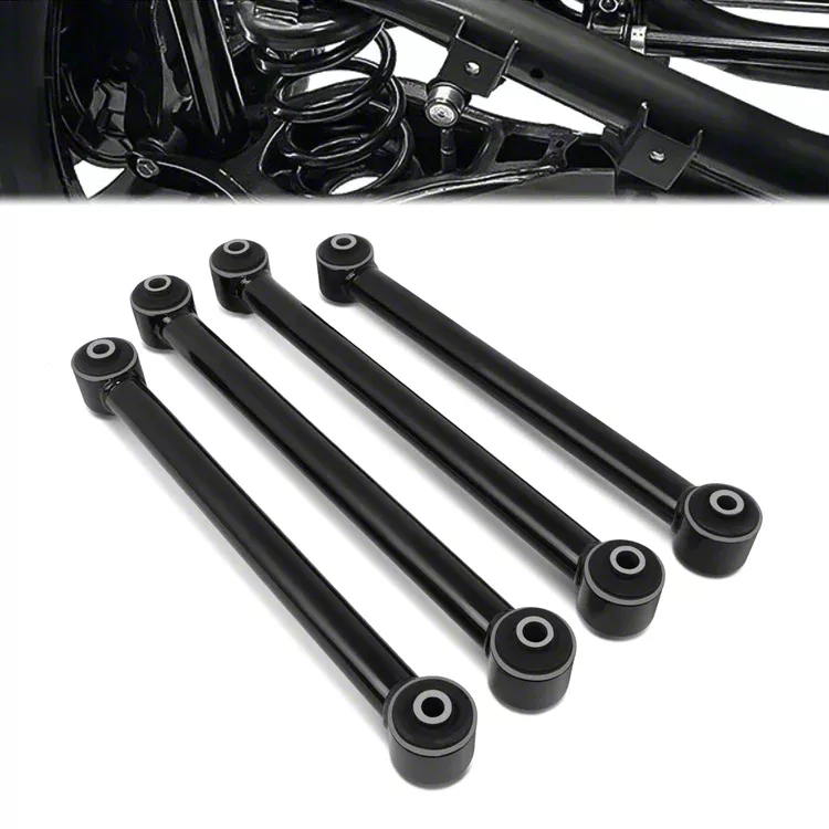 Construction and Appearance. Constructed from robust DOM steel tubing, these control arms are TIG-welded for superior strength and durability. They feature durable pressed rubber bushings and precise ball joints that ensure reliable articulation and alignment. What's more? The black powder-coated finish not only adds to the visual appeal but also provides corrosion resistance.