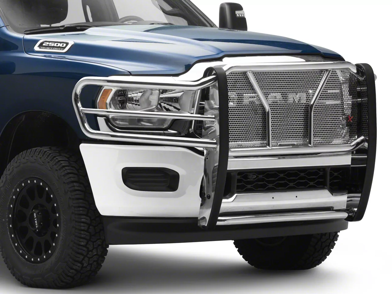 Stylish Grille Guard. Make everyone turn your way when they see your RAM sporting this HDX Grille Guard; Stainless Steel. Featuring a punch plate design and full wrap-around headlight guards, no one can resist looking at your stylish and functional grille guard.