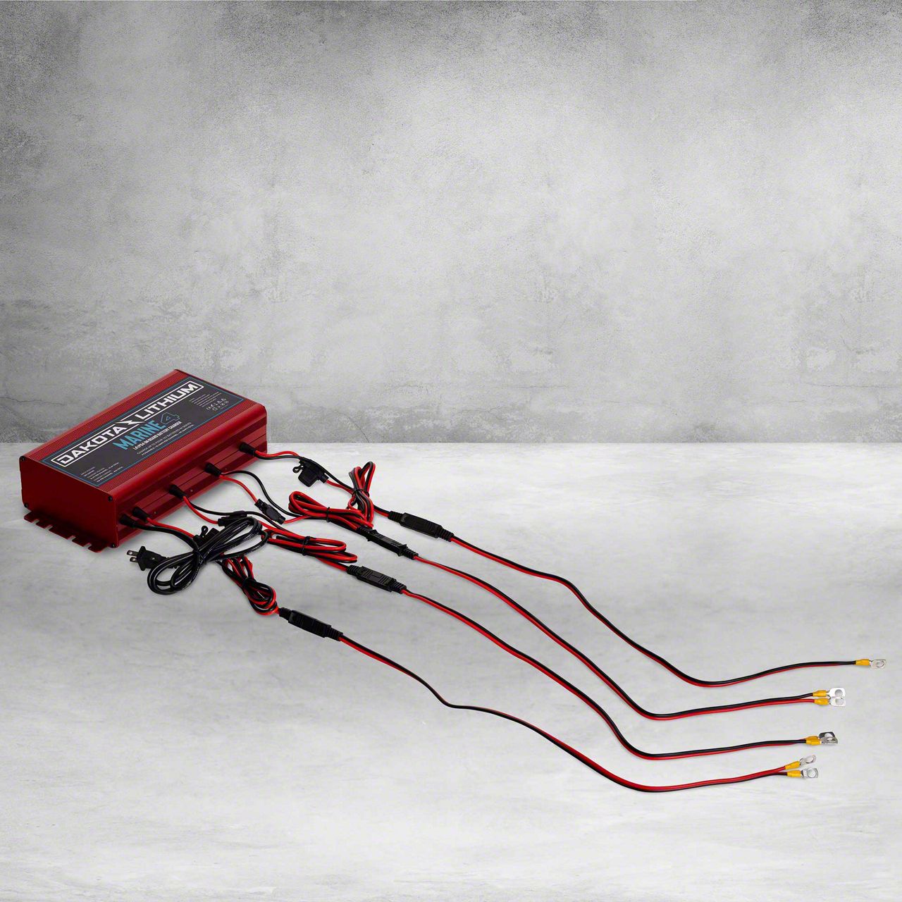 Description. Built for rugged reliability on and off the water, the Marine 4 is an onboard marine battery charger engineered exclusively for lithium batteries. With 4 channels/banks charging at 10 amps per channel/bank you can rapidly charge up to 4 Dakota Lithium batteries or any 12-volt lithium batteries, including marine, boat, starter, and deep-cycle batteries. This onboard charger is recommended for golf carts, trolling motors, RVs, or any battery bank where multiple 12V batteries are wired in series or parallel. By charging each battery independently this charger ensures your battery bank is balanced and fully charged every time — providing you with maximum performance and increased battery lifespan. Plus the ease of a waterproof charger installed onboard your vehicle saves you time and hassle every time you charge, giving you more time to do what you love. Designed for water this charger is double sealed, with a fully-sealed and waterproof onboard battery charger enclosed in a rugged and shock proof aluminum case with an ingress protection rating of IP67 for use in the coldest and wettest environments. Built for an extended lifespan this charger uses passive cooling to replace charger fans that commonly break with 4 aluminum fins that dissipate heat while providing enhanced shock proof and structural durability. Built for you. Built North Dakota tough.
